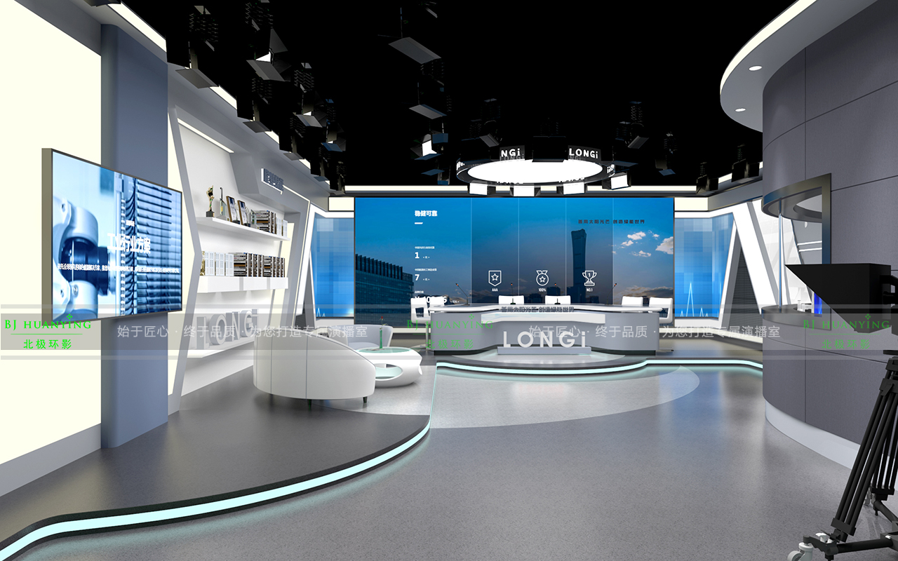 隆基股份全媒体演播室是集新闻制作、电视访谈、微课制作、虚拟拍摄等节目为一体的专业类综合演播室。在不失节目稳重的同时,又体现了演播环境的艺术品位,让节目与演播浑然一体是本建设的根本。本项目面积约110平米,施工周期70天,时间紧、任务重,我司在系统设计方案中充分满足隆基股份全媒体演播室节目制作的实际和发展需求,在设备选型及方案设计的整体性、先进性、可行性及安全性均具有独特的理念。