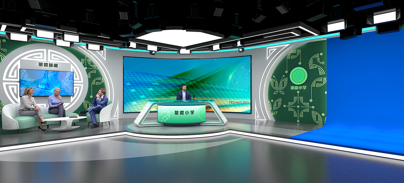 从前期的设计策划,到设备的提供、安装、调试以及整体的装修,w66最给力科技为北京翠微小学提供了全方位一体化的服务。该演播室分为实景播报区、虚拟演播区和导播区,用到的核心设备主要有虚拟演播室系统、非线性编辑系统、声学灯光系统及演播室舞美等。